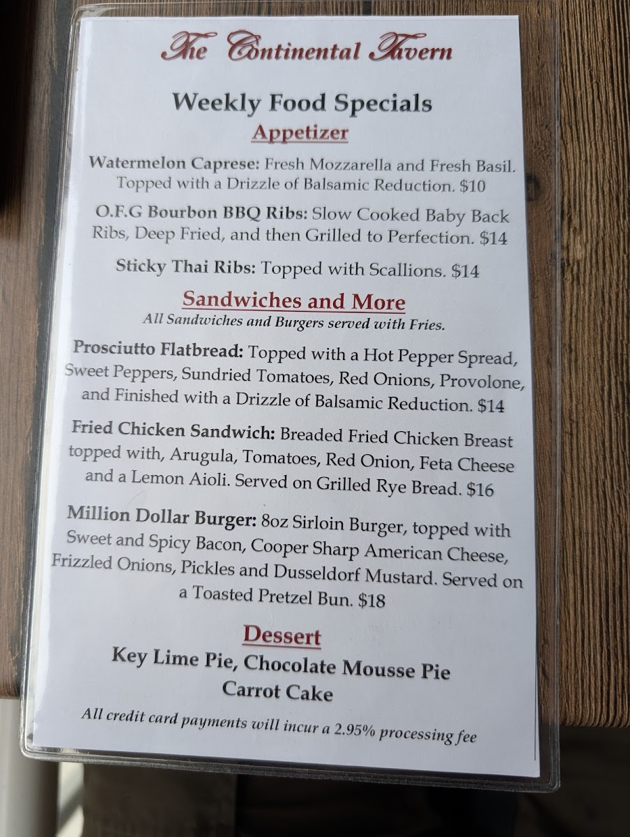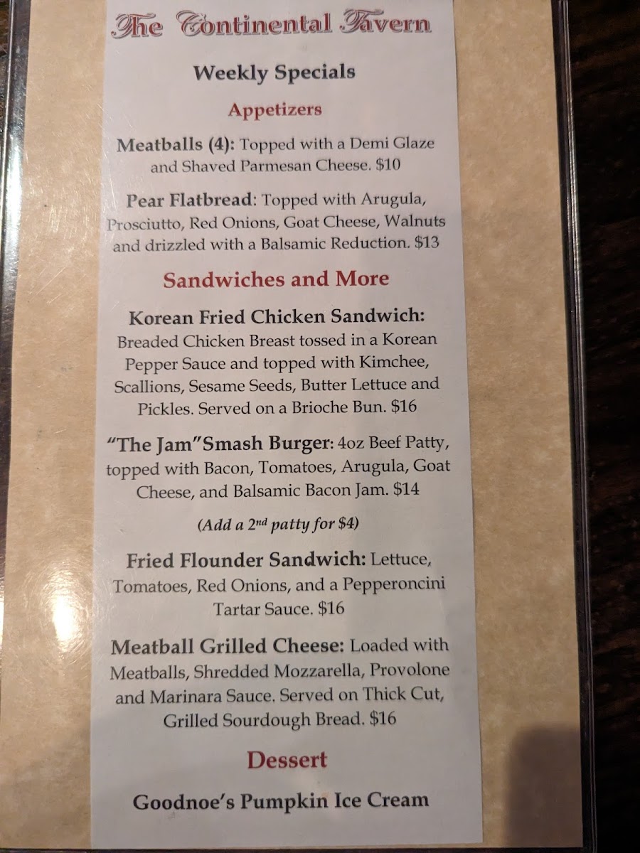 The sandwich selection doesn’t disappoint either, featuring hearty options like the Pulled Pork and the classic Reuben, both perfectly paired with crispy fries. Guests rave about the light and crispy fish and chips, a standout among the offerings. With friendly service and a vibrant atmosphere, Continental Tavern is more than just a restaurant; it's a place where great food and community come together.
